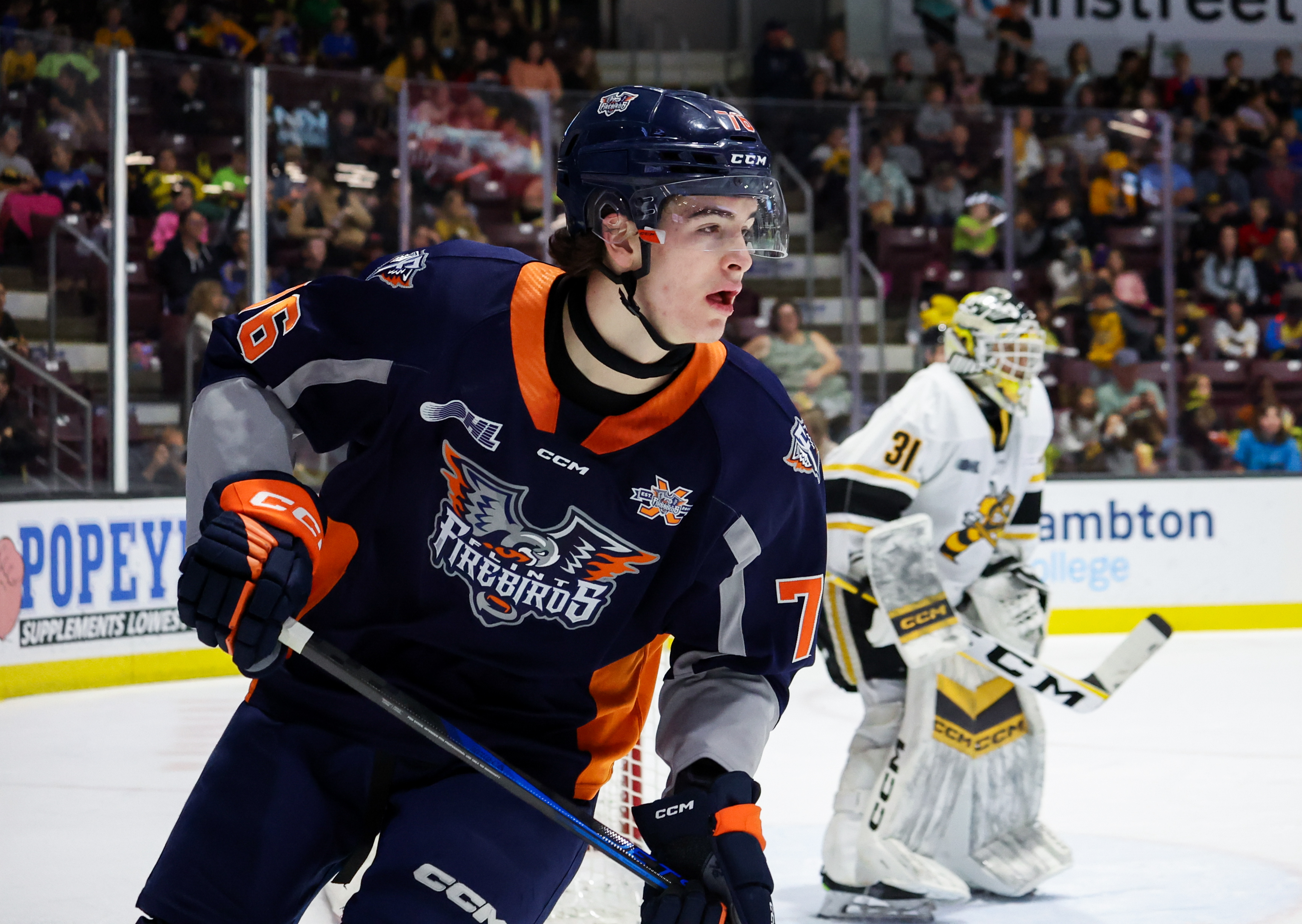 Nathan Aspinall had three primary assists to help his Flint Firebirds earn a 7-4 over the Sarnia Sting. The OHL’s leading scorer got going early when Aspinall found a wide open Jimmy Lombardi for a 1-0 Flint lead just 1:14 into the game.